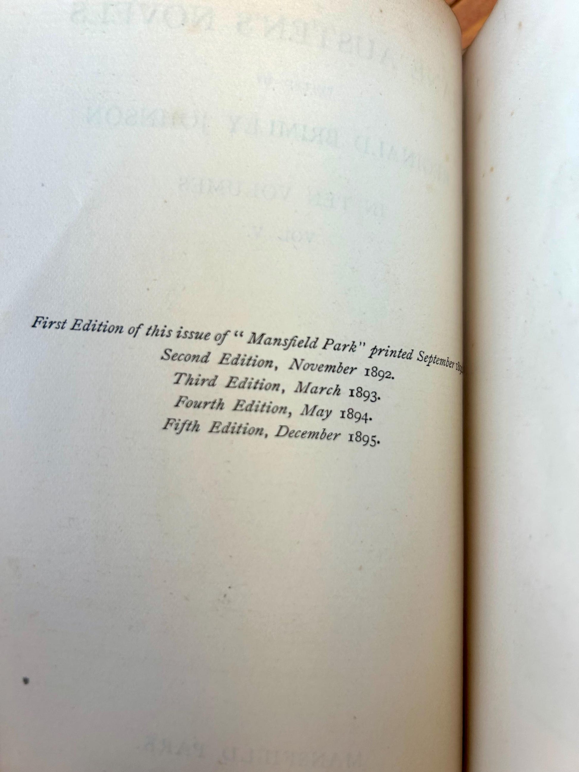 1895 Mansfield Park by Jane Austen. Published by J.M. Dent & Co, fifth edition. Bound in two volumes, illustrated